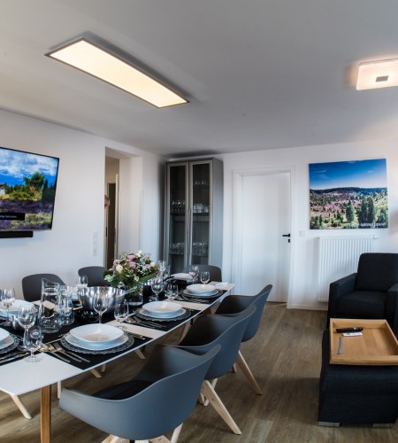 ...ist ausgestattet mit einem Design-Esstisch, bequeme Essstühle laden zu ausgiebigen Mahlzeiten und zum gemütlichen Verbleiben ein. Eine Ravensburger Spielesammlung, Monopoly-Spiel und ein Uno- und Skatblatt sowie Würfelbecher stehen für einen Spieleabend bereit.