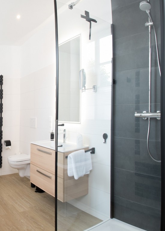 …sind modern und komfortabel eingerichtet. Das Masterbad: Ideal Standard Möbel-Waschtisch 80 cm breit, Dusche (90 x 100 cm) mit Glaskabine und Hansgrohe Thermostatarmatur mit Regenschauer-Kopfbrausen, Toilette: Villeroy & Boch O.novo/Deckel mit Absenkautomatik, beleuchteter Wand- sowie Kosmetikspiegel, Fön, Desinfektionsmittel + Kosmetiktücher. In der Dusche sowie am Waschbecken befinden sich befüllte Duschgel- bzw. Seifenspender. Die zwei einseitig offenen Design-Handtuchheizkörper sorgen für ein einfaches Ablegen der flauschigen Luxus-Badehandtücher, die übrigens mit einem Maß von 1,00 m x 1,50 m über ein normales Duschhandtuch hinausgehen.