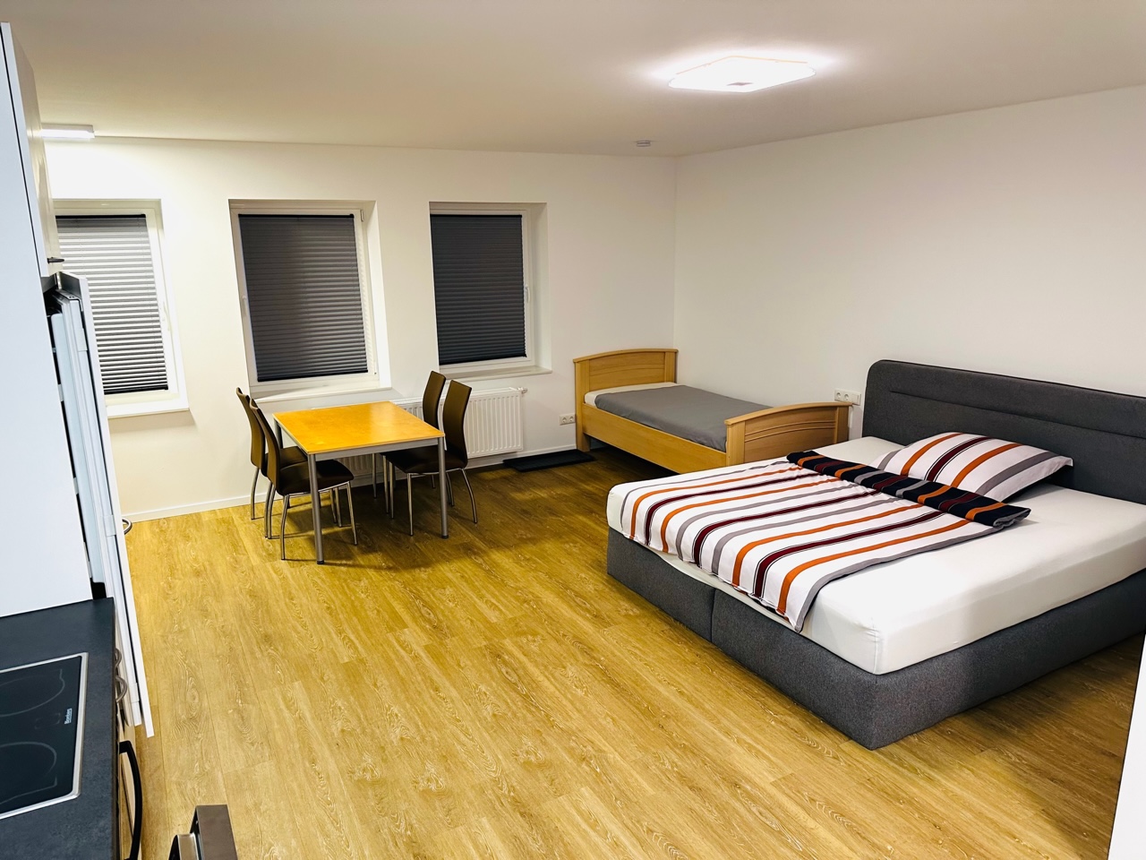 Für den komfortablen Schlafkomfort sorgt ein Boxspringbett (1,80 x 2,00 m) sowie ein weiteres Einzelbett. Ein 108 cm großer Smart-TV übernimmt das Entertainment.