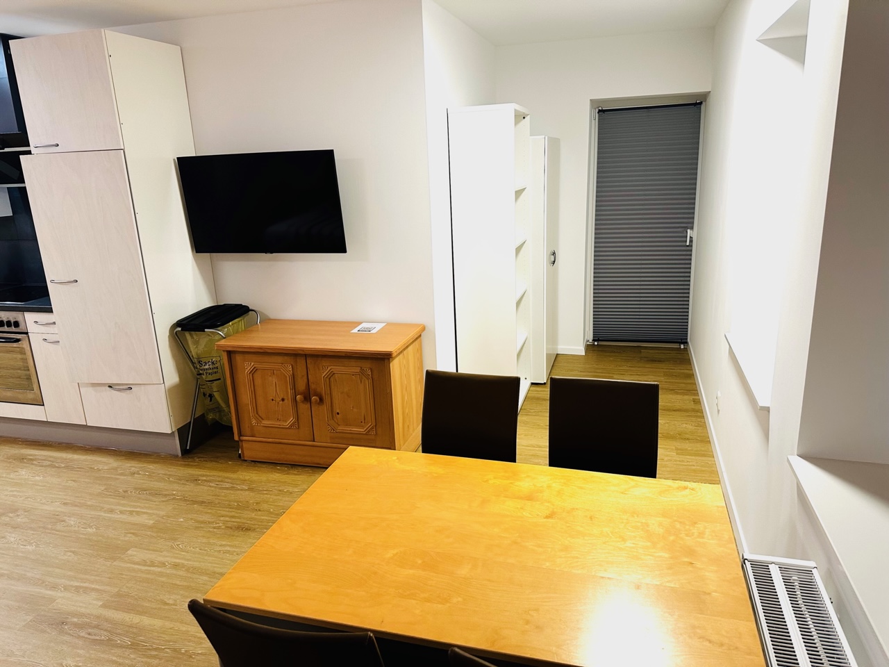Ein kleiner Balkon, Kleiderschrank, Regal sowie eine Garderobe und ein Ess-/Arbeitstisch mit drei Sesselstühlen sind ebenfalls vorhanden.