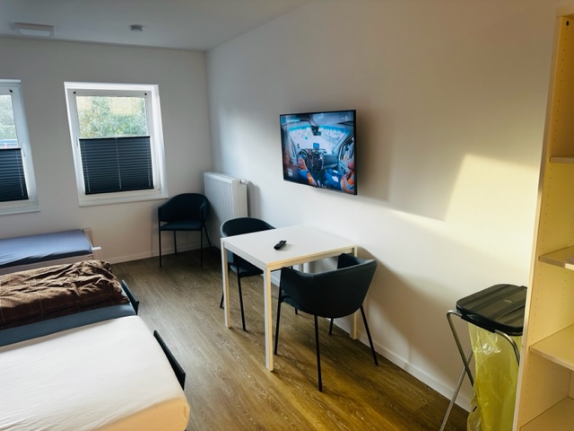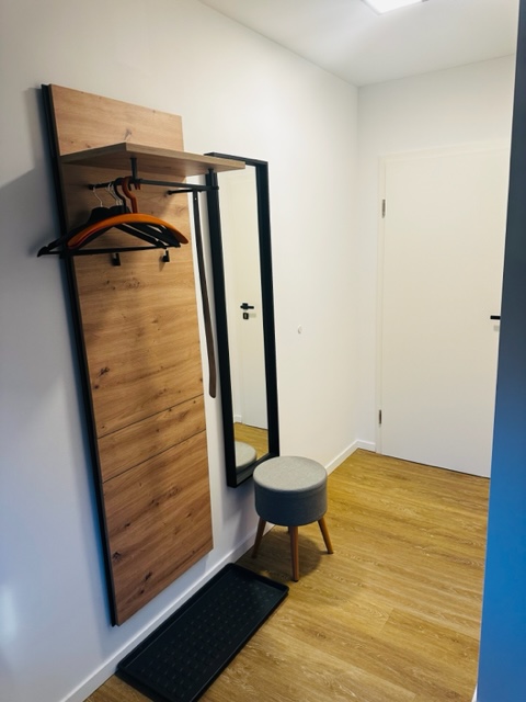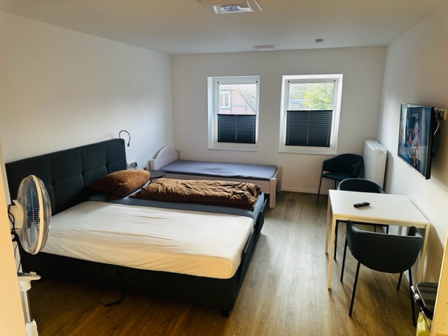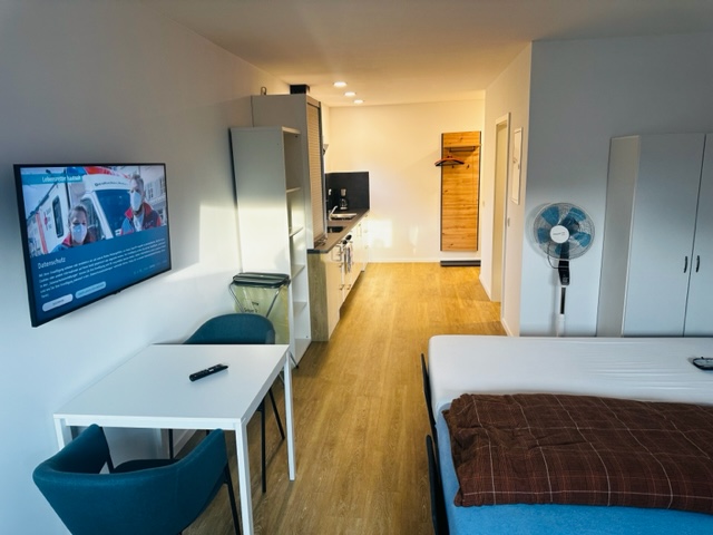 Für den komfortablen Schlafkomfort sorgt ein Boxspringbett (1,80 x 2,00 m) sowie ein weiteres Einzelbett. Ein 108 cm großer Smart-TV übernimmt das Entertainment. Ein Kleiderschrank, ein Ess-/Arbeitstisch mit drei Sesselstühlen sowie eine Garderobe sind ebenfalls vorhanden.