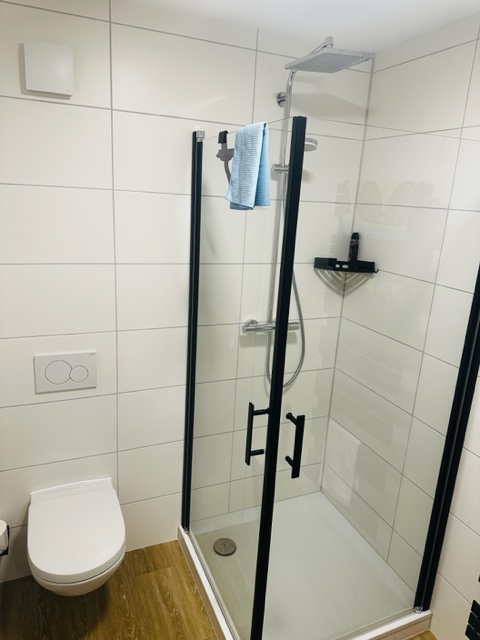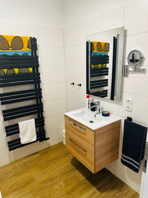 Das Bad ist modern und komfortabel eingerichtet. Ideal Standard Möbel-Waschtisch, Dusche mit Glaskabine und Hansgrohe Thermostatarmatur mit Rainshower-Duschkopf, Toilette: Villeroy & Boch O.novo, Design-Hand- tuchheizkörper, Kosmetikspiegel.