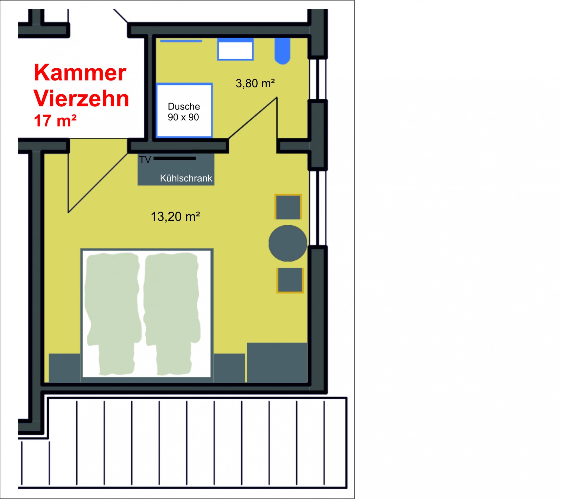 Die Kammer Vierzehn ist ein Doppelbettzimmer mit Duschbad in einer Gesamtgröße von 17,00 m².
