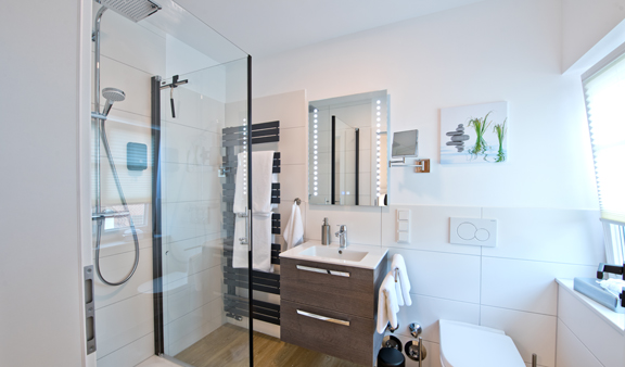Das Badezimmer ist modern und komfortabel eingerichtet. Ideal Standard Möbel-Waschtisch 60 cm breit, Dusche (90 x 90 cm) mit Glaskabine und Hansgrohe Thermostatarmatur mit Regenschauer-Kopfbrausen, Toilette: Villeroy & Boch O.novo, Kosmetikspiegel sowie Fön, Desinfektionsmittel + Kosmetiktücher. In der Dusche sowie am Waschbecken befinden sich befüllte Duschgel- bzw. Seifenspender. Der einseitig offene Design-Handtuchheizkörper sorgt für ein einfaches Ablegen der flauschigen Luxus-Badehandtücher, die übrigens mit einem Maß von 1,00 m x 1,50 m über ein normales Duschhandtuch hinausgehen.