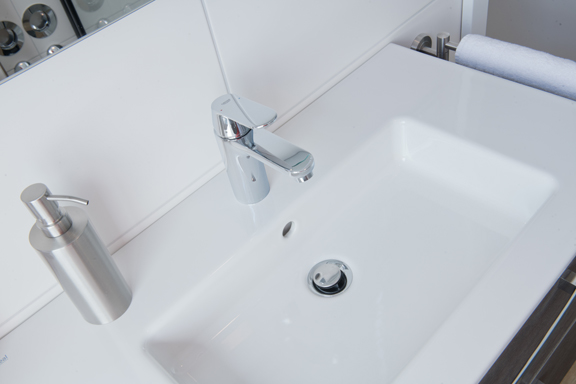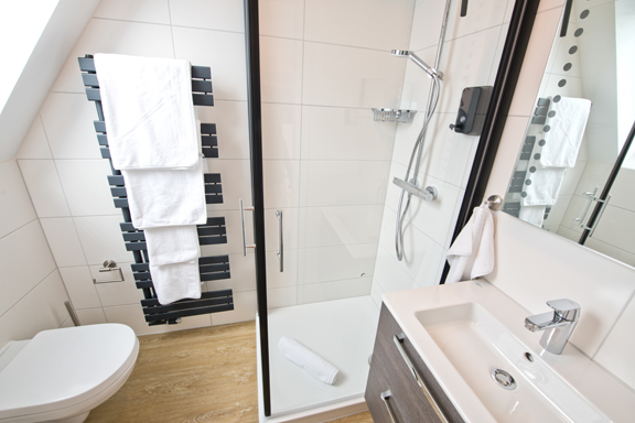 Das Badezimmer ist modern und komfortabel eingerichtet. Ideal Standard Möbel-Waschtisch 60 cm breit, Dusche (90 x 75 cm) mit Glaskabine und Hansgrohe Thermostatarmatur mit Regenschauer-Kopfbrausen, Toilette: Villeroy & Boch O.novo, Kosmetikspiegel sowie Fön, Desinfektionsmittel + Kosmetiktücher. In der Dusche sowie am Waschbecken befinden sich befüllte Duschgel- bzw. Seifenspender. Der einseitig offene Design-Handtuchheizkörper sorgt für ein einfaches Ablegen der flauschigen Luxus-Badehandtücher, die übrigens mit einem Maß von 1,00 m x 1,50 m über ein normales Duschhandtuch hinausgehen.
