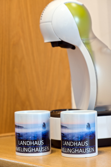 Die Kammer verfügt über ein neues "französisches" Hotel-Boxspringbett in einer Größe von 140 x 200 cm (zweiseitig an der Wand stehend) mit einer bequemen ca. 30 cm hohen Taschenfederkernmatratze inkl. Topper (Bettdecken 135 x 200 cm, Kopfkissen jeweils 80 x 80 cm sowie 40 x 40 cm), Schwanenhals-Leselampen, ein Nachtisch, Kleiderschrank, Sideboard, Hotel-TV, freies WLAN, Burg Wächter Tresor (35 x 25 x 25 cm), Tisch mit 2 Stühlen, Kofferablage, Garderode/Spiegel, Kühlschrank mit Gefrierfach (Eiswürfel, eine Flasche Mineralwasser – Medium ist kostenfrei enthalten), Dolce Gusto-Kapselmaschine von LeLonghi (4 Kapseln sind kostenfrei enthalten), Tassen, Gläser, Teller und Bestecke.