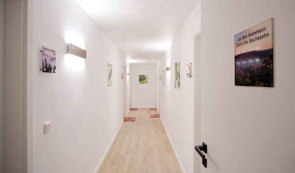 Das Kammerfenster ist mit einem Abdunkelung-Plissee (Dimout) ausgestattet sowie Design-Fußbodenbelag in Eichenholzoptik.